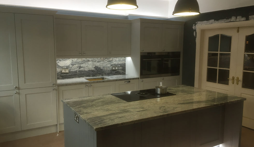 Stunning Shaker Kitchen Painted to order!! We recently carried out work in a period property in Lanarkshire, the client was keen to keep the original coving in the room so this had to be taken into account when we were removing the load bearing wall and inserting the steel beam. To keep the room as open and bright as possible we used the new ComboHob from AEG which has the extractor integrated into the hob removing the requirement for a ceiling extractor. As with all of our jobs we took complete control of all works including the stunning Herringbone LVT flooring. Some of the main features of this kitchen are Painted Shaker Doors, Granite worktops and Splashback, boiling water tap and lighting features.