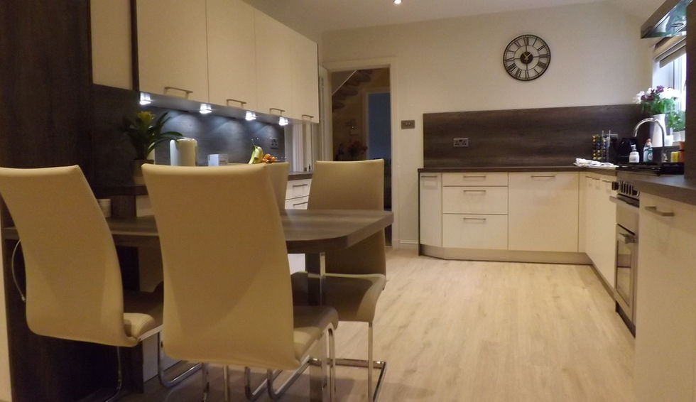 This kitchen in Newton Mearns we fitted recently features the Uni Matt Magnolia door mixed with Oak Havanna Brown worktops and splashbacks. Once again we were required to remove internal load bearing walls and install supporting steel work. This work, as always, was carried out by our very own tradesmen. In the utility room we created an area for stacking the washing machine and tumble dryer, complete with storage area for the ironing board!