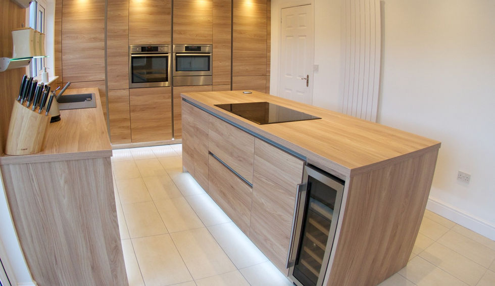 Natural Elm doors on the X2 Handleless range from Schueller with Pull out larders, AEG appliances, Gutmann Ceiling extractor, lighting features and coordinating TV unit. Finished off with floor tiling and decoration, all project managed by Kitchens Plus Interiors.